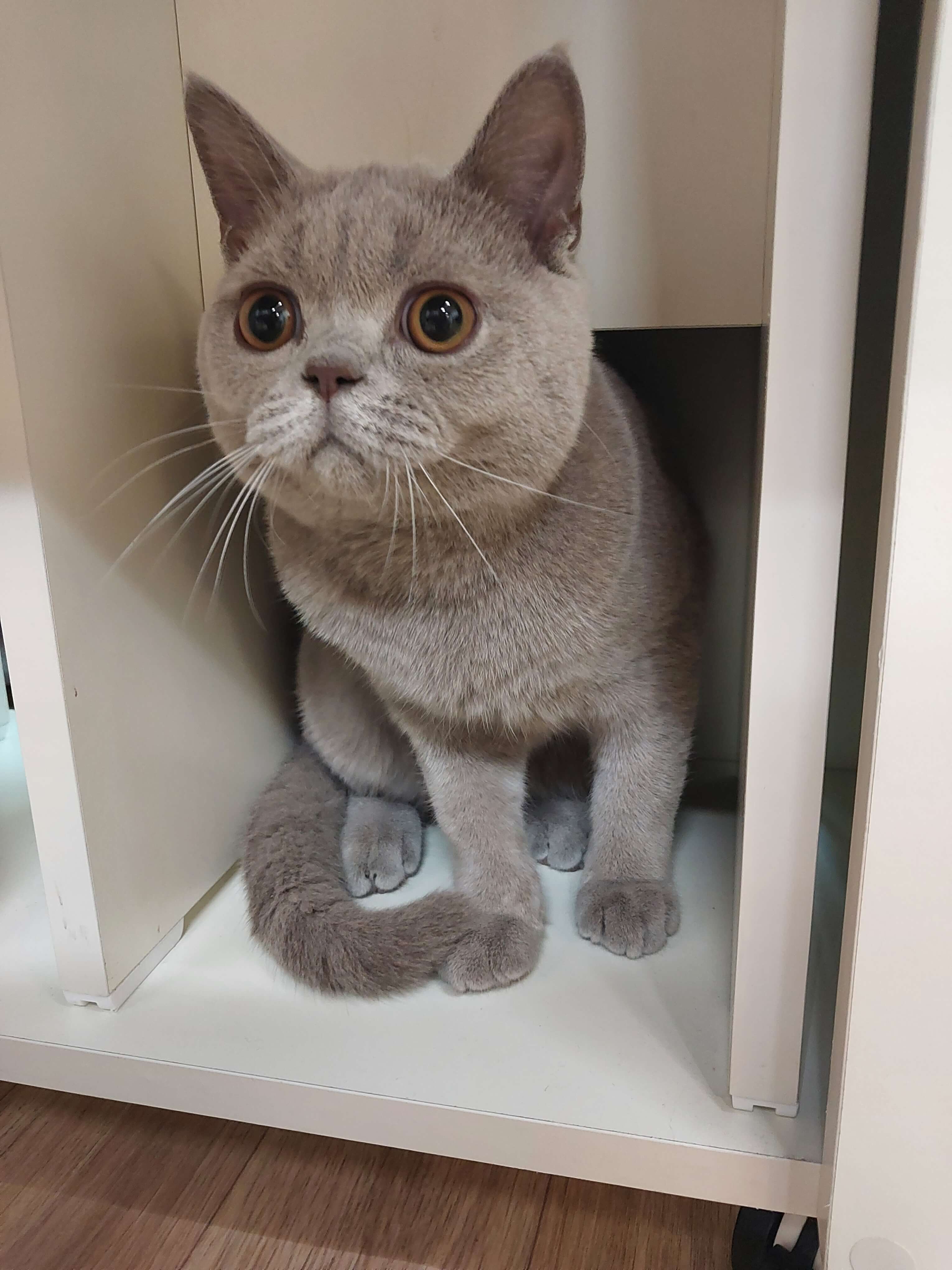 저희 누니는 분양 카페에서 한 번 파양 된 경험이 있는 아이였습니다. 아이한테 문제가 있어서 파양 된 게 아니라 갑작스러운 사정으로 키우지 못하게 되어 일주일 만에 다시 데리고 오셨다고 합니다. 누니는 브리티시숏헤어인데 장화 신은 고양이의 모티브가 된 고양이라고 해요. 게다가 털색깔은 흔치 않은 라일락이라고 귀한 종이라고 하셨어요. 브리티시숏헤어는 성격이 순한 개냥이 과라서 지내는 데는 어려움이 없을 거라고 알려주셨어요. 사장님 말로는 원래 분양가 110만 원이었는데, 4개월쯤 되면 아깽이보다는 덩치가 크니까 사람들이 잘 안 찾아서 일주일 전에 55만 원으로 낮췄다고 하더군요. 딸한테 깜짝 선물을 주려고 바로 안 데리고 오고 저녁에 남편과 함께 분양카페를 다시 갔습니다. 분양카페에서 집까지 10분 정도 걸리는데요. 집으로 오는 동안 케이지 안에서 몸을 최대한 웅크린 채 작게 소리 내는 아기 고양이를 보고 이 아이에게 오히려 새로운 집은 스트레스가 아닐까, 잘못된 선택은 아닐까, 걱정했습니다. 계속 괜찮아 괜찮아하면서 고양이를 안심시켰는데 지금 돌이켜 생각해 보니 사실은 제가 더 긴장했던 것 같아요.
